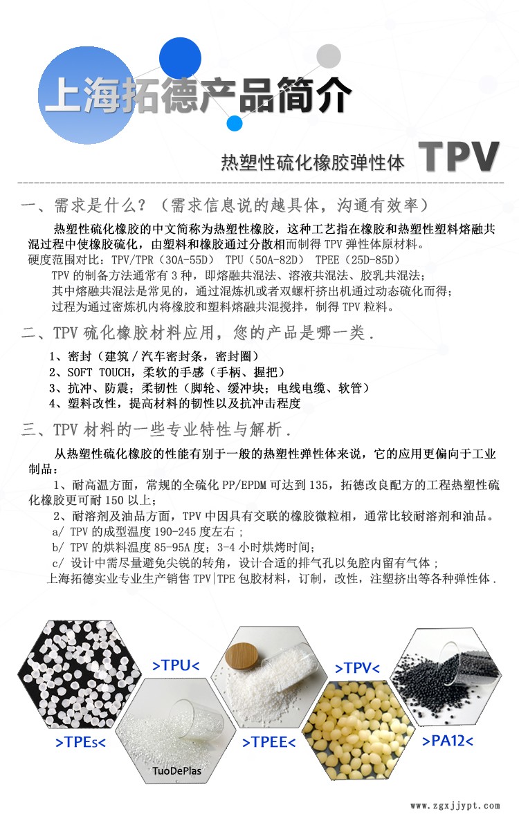 拓德全程提供詳細(xì)TPV、TPR、TPO、TPVE、TPU、PA12彈性材料產(chǎn)品資料。