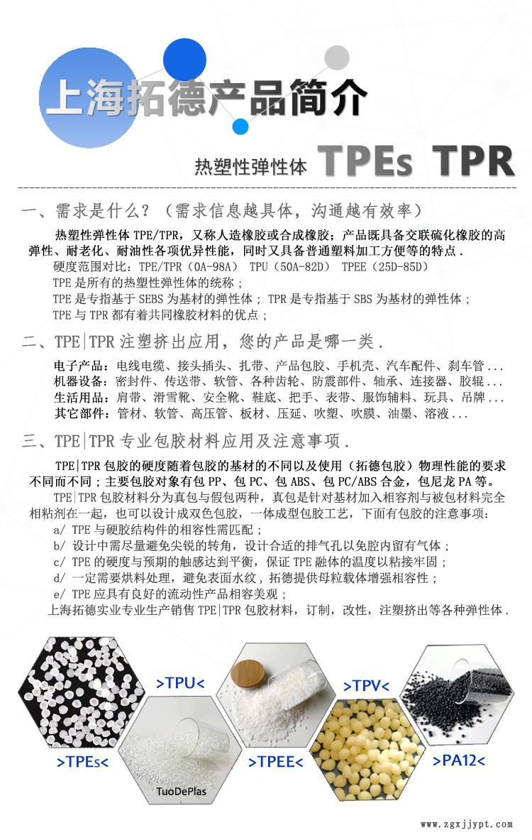 上海拓德實(shí)業(yè)有限公司為工廠直銷,TPE,TPR材料具有加工性能優(yōu)越,無(wú)須硫化等特點(diǎn).