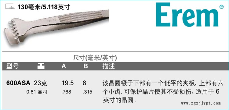 600ASA | 23克 | 該晶圓鑷子下部有一個(gè)低平的夾板,上部有六個(gè)小齒,可保護(hù)晶片使其不受損傷。適用于6英寸的晶圓。 | |
