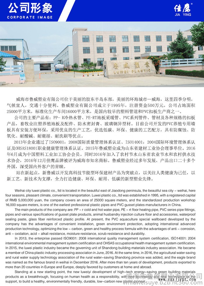 威海市魯威塑業(yè)有限公司位于美麗的膠東半島東部,美麗的環(huán)海城市—威海,這里四季分明,氣候宜人,交通十分便利。魯威塑業(yè)有限公司成立于1995年,注冊(cè)資金500萬元,公司占地面積25000平方米,標(biāo)準(zhǔn)化生產(chǎn)車間16000平方米,是國(guó)內(nèi)較早的塑料管道和PVC扣板生產(chǎn)商之一。