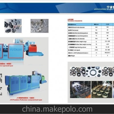 預(yù)成型機介紹1、該機主要用于準(zhǔn)備橡膠模型制品生產(chǎn)用的各種環(huán)、圓形、矩形以及其他形狀制品用的膠坯。對各種高硬度的丁晴膠、天然膠]、氯丁膠.三元乙丙等均可以適用。擠出裝置可單獨作為柱塞式擠出機使用,可用于濾膠及制作膠條等。2、采用變頻電機,切刀實現(xiàn)無級調(diào)速,切割膠坯精度更準(zhǔn)確。3、有兩套冷卻系統(tǒng)。(水冷系統(tǒng)為常規(guī)型。風(fēng)冷系統(tǒng)根據(jù)需要選配。)可根據(jù)需要,選擇節(jié)約電源或高強度降溫。4、目前早在我國橡膠工業(yè)制品的生產(chǎn)中,膠坯準(zhǔn)備仍然是手工勞動量較大的工序。使用本機能大大提高工作效率。如廠生產(chǎn)汽車發(fā)動機后懸置上軟墊,傳統(tǒng)方法要勞動力6個人,半成品準(zhǔn)備工時169件/時。用精密預(yù)成型機只要2人,半成品準(zhǔn)備工時3060件/時生產(chǎn)效率提高18倍。使用本機能節(jié)約膠料。一般來說,手工準(zhǔn)備膠坯的幾何形狀及厚度不準(zhǔn),手工秤量通常存在寧大勿小的傾向,往往大大超過制品的重量,膠坯的準(zhǔn)確度在5%左右,導(dǎo)致大量的膠料浪費,每1000Kg要用膠料20Kg而使用預(yù)成型機制造的膠坯重量可達(dá)±1.5%硫化成品的流膠邊薄,容易修邊,尺寸穩(wěn)定,節(jié)約了原材料,提高了經(jīng)濟(jì)效益。使用本機也保證了產(chǎn)品質(zhì)量。該機在切割前經(jīng)抽真空,可使膠坯勻均密致,無氣泡,形狀接近成品,環(huán)形膠坯無接頭,硫化時裝模迅速,方便,減少了成品的膠料流動痕跡、缺膠及接頭裂口等缺陷,保證了產(chǎn)品的內(nèi)在和外觀質(zhì)量。提高了產(chǎn)品的回顧率及等級品率