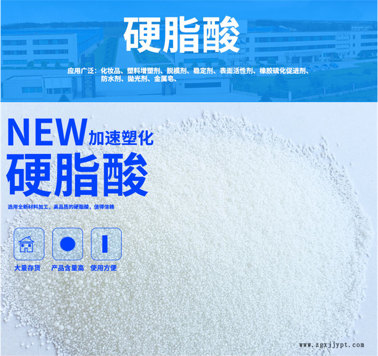 還可作聚乙烯,聚丙烯的鹵素吸收劑,以消除殘留催化劑對顏色和穩(wěn)定性的不良影響。在橡膠加工中作增塑劑,能使天然橡膠和全成橡膠軟化,而對硫化幾乎無影響。亦用作聚烯烴纖維和模塑料的潤滑劑,潤滑脂的增厚劑,紡織品的防水劑,油漆的平光劑,制造塑料唱片時的增塑劑等。聚乙烯、聚丙烯中作為鹵素吸收劑; 酚醛、氨基等熱固性塑料的潤滑劑和脫模劑; 潤滑脂的增厚劑; 防水織物的防水劑; 油漆的平光劑及鉛筆芯的潤滑劑等。食品級的硬脂酸鈣用作抗結(jié)劑。硬脂酸鈣還用在鉛筆芯生產(chǎn)及醫(yī)藥、香料工業(yè)中。