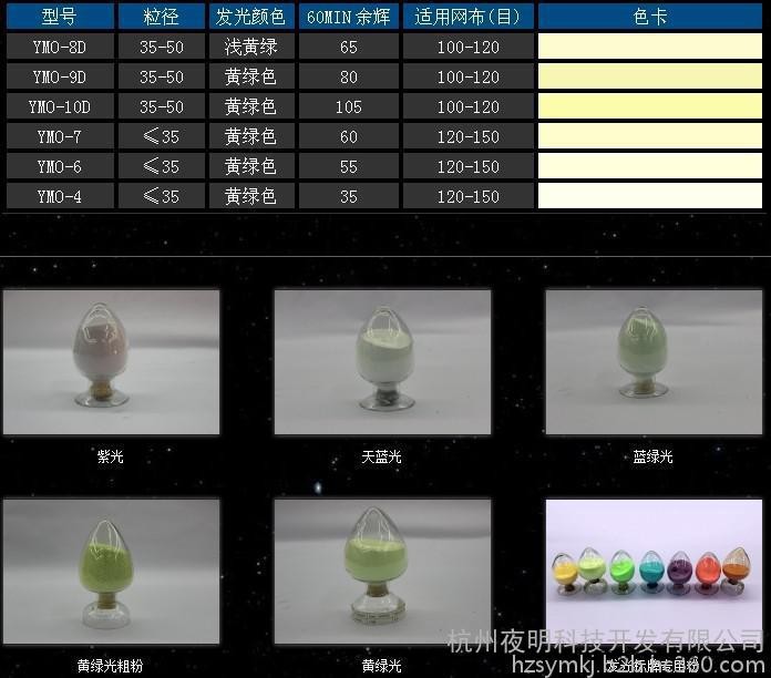 YMO 系列產(chǎn)品為堿土鋁酸鹽材料,原態(tài)外觀呈黃綠色或者淺黃色,發(fā)光顏色為黃綠色YMB 系列產(chǎn)品為堿土鋁酸鹽材料,原態(tài)外觀呈灰白色或者淺黃色,發(fā)光顏色為藍綠色YMS 系列產(chǎn)品為堿土硅酸鹽材料,原態(tài)外觀呈淺灰色或淺黃色, 發(fā)光顏色為天藍色YMR 系列產(chǎn)品為硫氧化物系列,原態(tài)外觀呈橙色或淺紅色,發(fā)光顏色為橙紅色或紅色YMF 系列產(chǎn)品為堿土鋁酸鹽材料,原態(tài)外觀呈黃綠色或者淺黃色,發(fā)光顏色為黃綠色YMLS 系列產(chǎn)品為堿土硅鋁酸鹽材料,原態(tài)外觀呈灰白色或者淺黃色,發(fā)光顏色為淡藍色夜明牌發(fā)光顏料的廣泛應用可將發(fā)光顏料添加在油墨油漆,塑料橡膠,印花漿,玻璃,陶瓷,纖維等半透明以上介質(zhì)中,如1:添加至油墨中可用于印刷發(fā)光地名標志,發(fā)光消防標志,交通標志等2:添加至油漆中可用于噴涂,粉刷至各種基材表面,實現(xiàn)制品表面發(fā)光功能3:添加至塑料中可制得發(fā)光塑料母粒,發(fā)光塑料成型制品4:添加至橡膠中可制得發(fā)光按鍵,發(fā)光防滑膠貼,以及其他發(fā)光玩具等