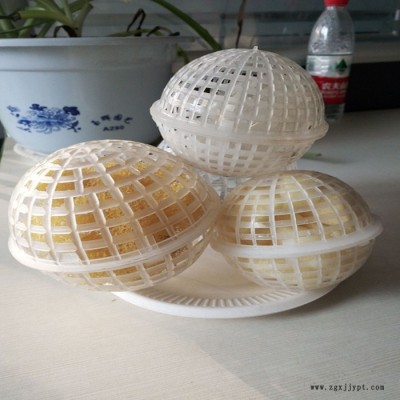 該填料中有聚乙烯或聚丙烯材料注塑而成,分內外雙層球體,外部為中空魚網狀球體,內部為轉型球體,在使用過程中,微生物易生成、易更換、耐酸堿、化,不受水流影響,使用壽命長,剩余污泥極少,安裝方便。