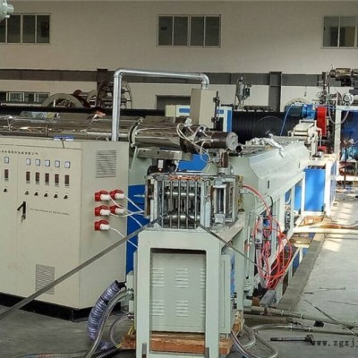 大口徑中空壁纏繞管生產線包括異型管擠出機及擠出機頭、模具,纏繞成型機及成型模具,熔膠擠出機,真空定徑系統(tǒng),噴淋水箱,切割機,卸料臺及生產控制系統(tǒng)。